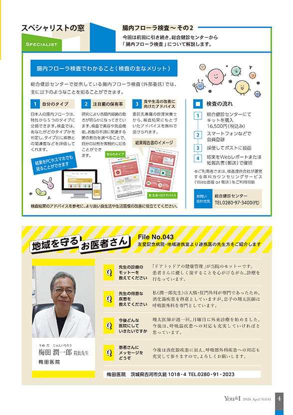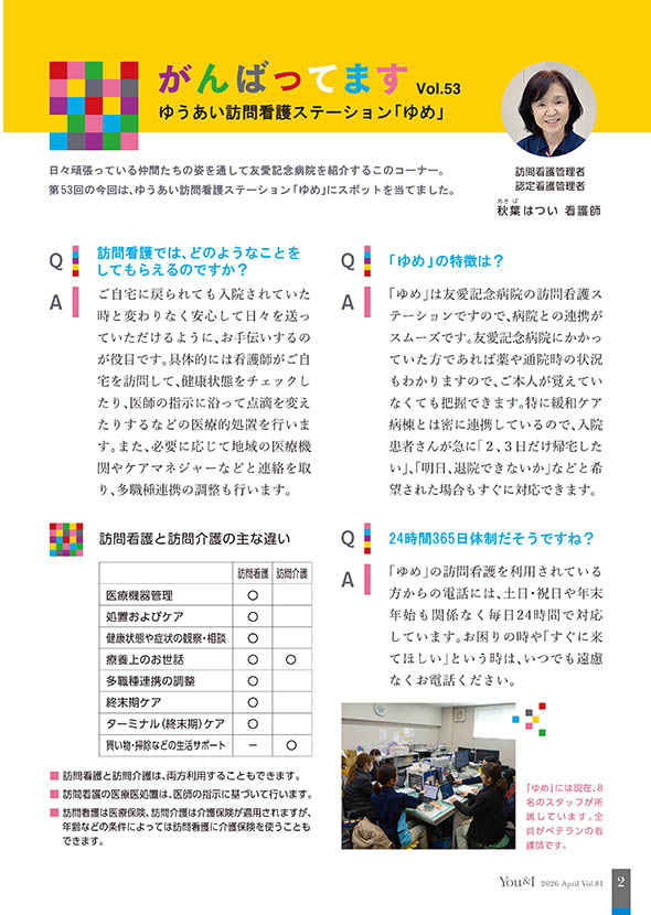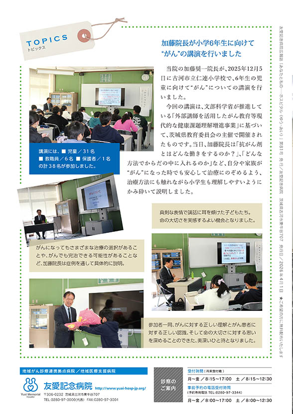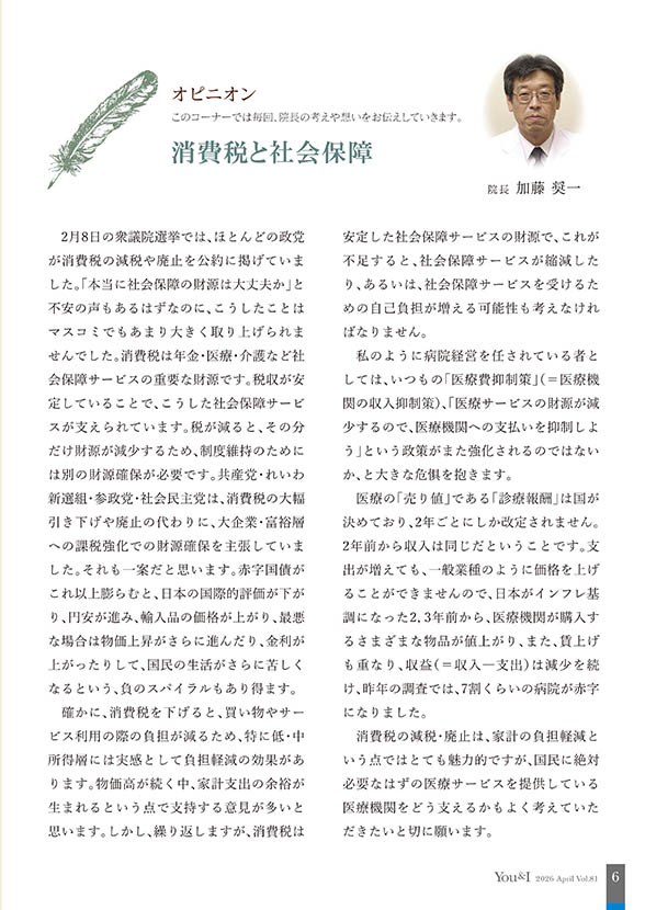 トップページ > 病院のご案内 > 広報誌「You&I」 コンテンツメニュー 病院のご案内トップ 患者さんの権利と責務 パートナーシップ 医療従事者の負担軽減及び処遇改善の取組み 病院について 院長挨拶・プロフィール オピニオン 沿革 病院機能評価認定病院 院内案内図 撮影・録音等について 敷地内禁煙について 地図/交通機関案内 友愛ギャラリー 院内感染対策指針 安全管理基本方針 人生の最終段階における適切な意思決定支援に関する指針 診療実績 病院情報の公表 連携充実加算情報 診療科案内 消化器科/外科 一般内科 循環器内科 呼吸器内科 糖尿病科 血液内科 肝臓科 血管外科 呼吸器外科 形成外科 肛門外科 乳腺甲状腺外科 小児科 眼科 整形外科 脳神経外科 泌尿器科 皮膚科 婦人科 緩和ケア科 禁煙支援外来 放射線腫瘍科 しゃっくり外来 救急科 病理診断科 麻酔科 放射線診断科 部門紹介 薬剤科 放射線治療室 放射線診断室 検査科 超音波・病理診断科 栄養科 臨床工学科 リハビリテーション科 医事課-診療録管理室- 看護部 看護部トップ 教育・研修・委員会 体制 昇格・昇進 看護部研修会の御案内 多施設新人看護職員研修会 協働推進事業医療従事者のためのセミナー 医療的ケア教員講習会 資料請求、病院見学・説明会、採用試験、奨学金制度 インターンシップオリエンテーション オンライン説明会 患者支援センター がん相談支援センター 医療福祉相談 地域医療支援病院 地域がん診療連携拠点病院 がん診療内容 院内がん登録について 院内がん登録統計 がん相談支援センター セカンドオピニオンについて 乳がん患者はなももの会 緩和ケア研修会 市民公開講座 がん診療連携協議会 がん関連研修会 緩和ケア 心不全地域連携について 手術支援ロボット ダヴィンチ 医療相談・指導 医療安全患者相談 栄養指導 ストーマ外来 栄養サポートチーム(NST) 患者サポート体制 病院ボランティア 広報誌 よくある質問 バックナンバー Vol.81 表紙 JPGファイル PDFファイル 1P ・おもひであるばむ古河の風景「昭和31年 秋」 JPGファイル PDFファイル 2P ・がんばってます Vol.52 ゆうあい訪問看護ステーション「ゆめ」 JPGファイル PDFファイル 3P ・2Pの続き JPGファイル PDFファイル 4P ・スペシャリストの窓「腸内フローラ検査~その2」・地域を守るお医者さん No.043「梅田医院 梅田 潤一郎 院長先生」 JPGファイル PDFファイル 5P ・肝がんについて その1 JPGファイル PDFファイル 6P ・オピニオン 消費税と社会保障 JPGファイル PDFファイル 裏表紙 ・トピックス 加藤院長が小学6年生に向けて"がん"の講演を行いました JPGファイル PDFファイル バックナンバー 選択してください。 #vol.81 #vol.80 #vol.79 #vol.78 #vol.77 #vol.76 #vol.75 #vol.74 #vol.73 #vol.72 #vol.71 #vol.70 #vol.69 #vol.68 #vol.67 #vol.66 #vol.65 #vol.64 #vol.63 #vol.62 #vol.61 #vol.60 #vol.59 #vol.58 #vol.57 #vol.56 #vol.55 #vol.54 #vol.53 #vol.52 #vol.51 #vol.50 #vol.49 #vol.48 #vol.47 #vol.46 #vol.45 #vol.44 #vol.43 #vol.42 #vol.41 #vol.40 #vol.39 #vol.38 #vol.37 #vol.36 #vol.35 #vol.34 #vol.33 #vol.32 #vol.31 #vol.30 #vol.29 #vol.28 #vol.27 #vol.26 #vol.25 #vol.24 #vol.23 #vol.22 #vol.21 #vol.20 #vol.19 #vol.18 #vol.17 #vol.16 #vol.15 #vol.14 #vol.13 #vol.12 #vol.11 #vol.10 #vol.9 #vol.8 #vol.7 #vol.6 #vol.5 #vol.4 #vol.3 #vol.2 #vol.1 創刊号 広報誌 You & Iトップへ PDFファイルでご覧になるにはAdobe Reader(無料)が必要です。お持ちでない場合は右記より、ダウンロードしてください。